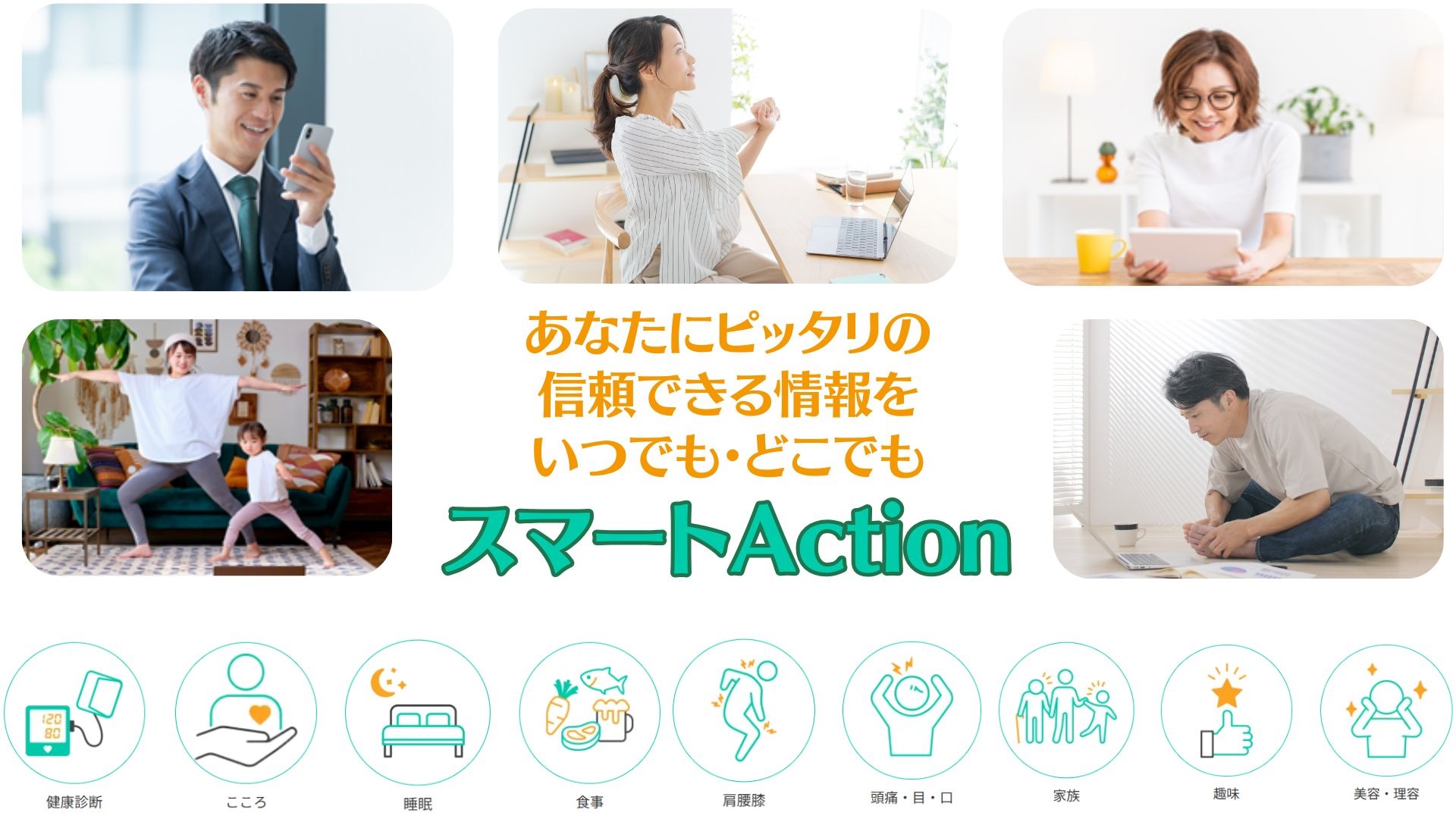 「スマートAction」とは、心と身体の健康をサポートするオンラインサービスです。多彩なセミナーやエクササイズ動画をいつでも・どこでもご覧いただけます。