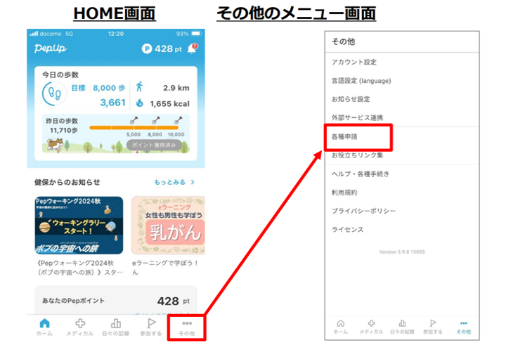 スマホからは「その他」→「各種申請」→「心臓ドック検査 補助」より申請